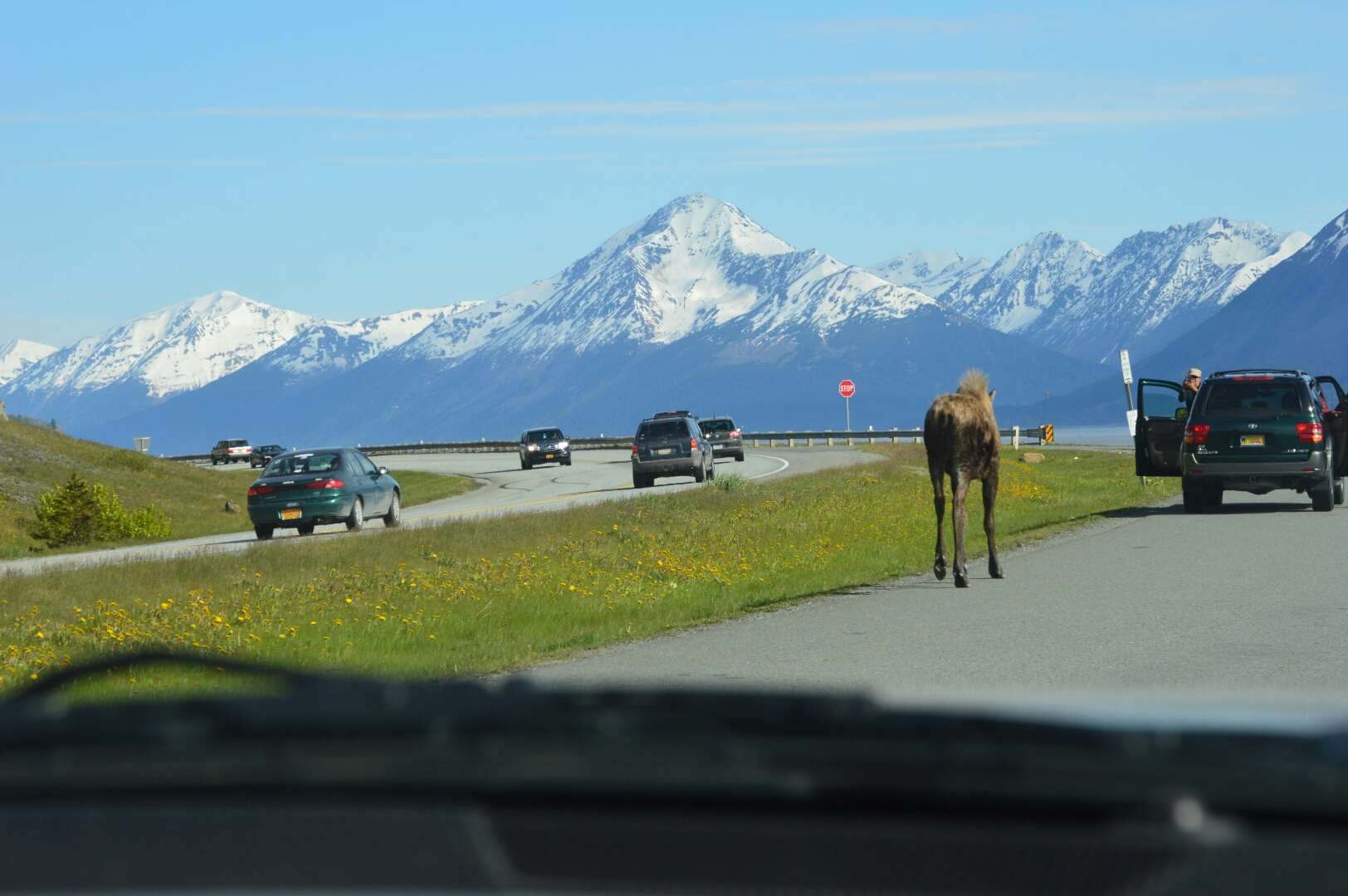 In the midst of heavy traffic what should run out into the middle.of the road, but a full grown moose!